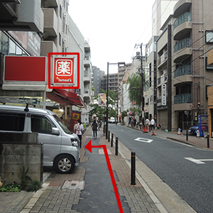 左手に赤い「薬」の看板(TOMOD’S)が見えます。そのビルの5Fです。 |