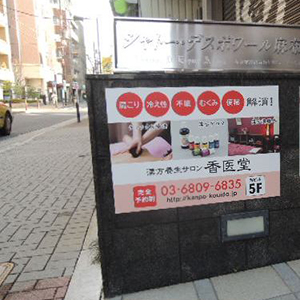 香医堂の看板があります。インターフォンで504号室をお呼びください。 |
